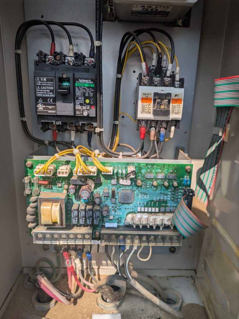 次にマグネットスイッチ(ブレーカーみたいなやつ)を調べてみると一次側(上)は電圧が正常にきているけど二次側(下)のS相に電圧が無いことを発見